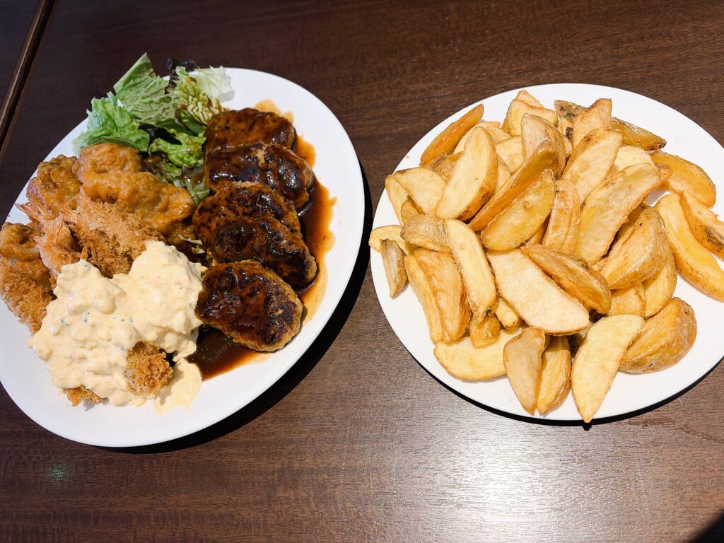 エビフライ、唐揚げ、ハンバーグ、フライドポテトと、