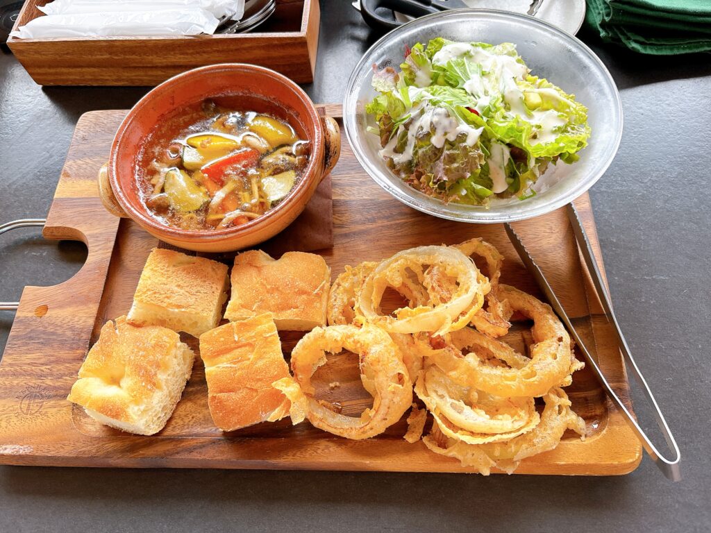 ランチセットにはサラダ・スープ・パンが付いており、ボリュームも満足感があります。