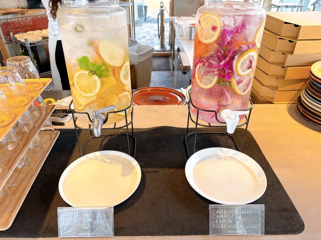 また、店内にはお水の代わりにデトックスウォーターが2種類用意されており、自由に楽しめるのも嬉しいポイント。
