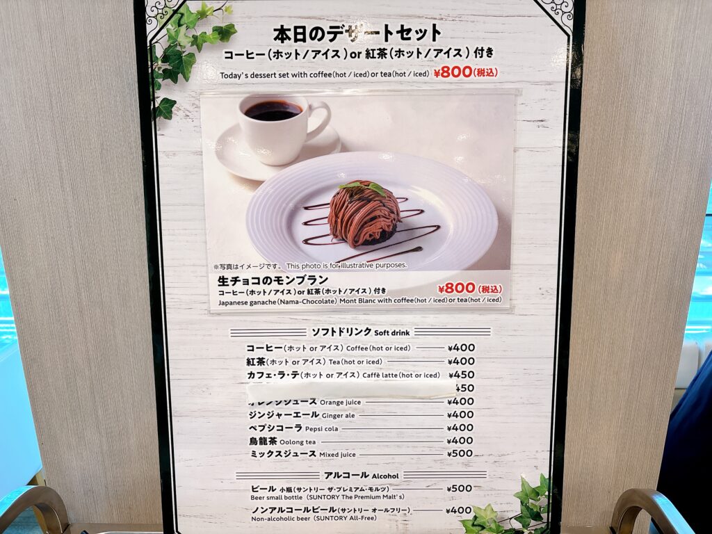 『本日のデザートセット(800円)』のほか、ケーキやコーヒーも用意されており、食後にゆっくりティータイムを楽しむこともできます。