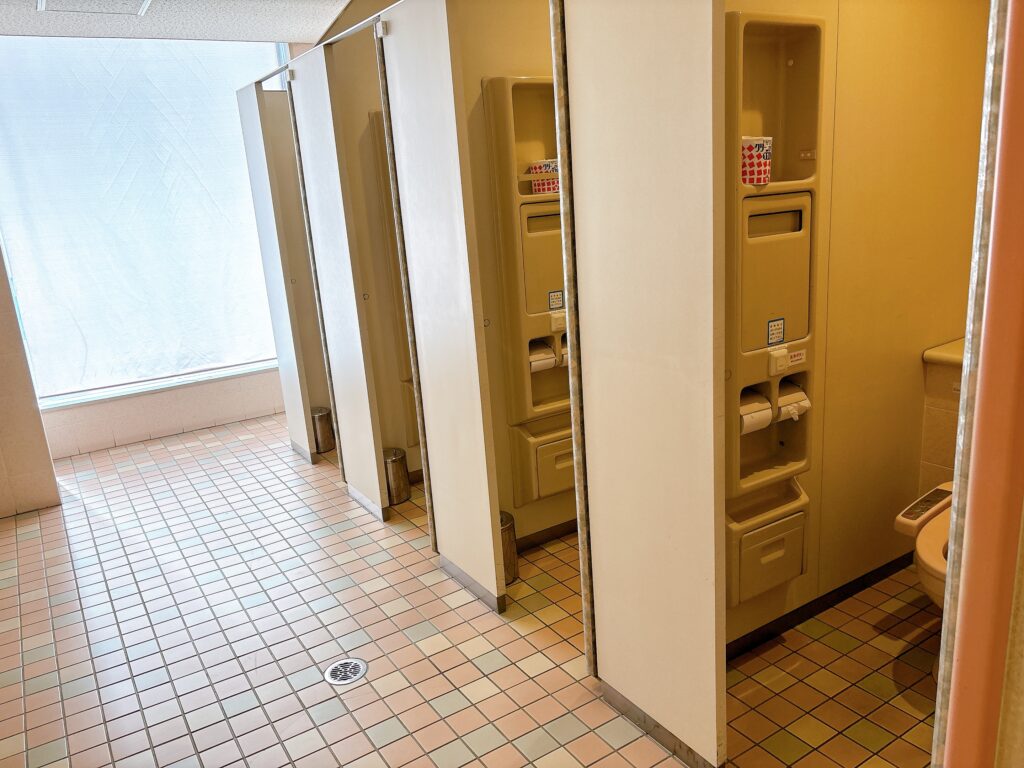 トイレ自体は広くスロープ付きでベビーカーのまま入れますが、おむつ替え用のベッドなどは見当たりませんでした。